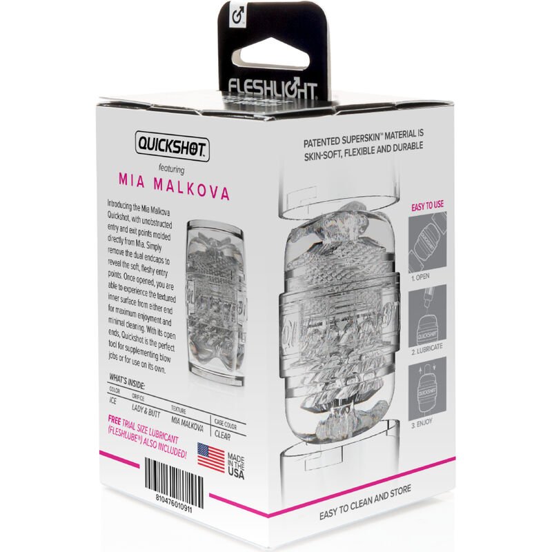 Con il Mia Malkova Quickshotâ„¢ï¸ trasparente e compatto di Fleshlight®ï¸, potrai vedere ogni momento soddisfacente di piacere personale. Dotato della vagina e del sedere di Mia, il Quickshot ti offre due modi per goderti il tempo con questa dea del sesso. Oppure invita un partner per un’azione orale a tre con Mia. Con così tanti modi per goderti Mia Malkova, potresti non uscire mai più di casa!